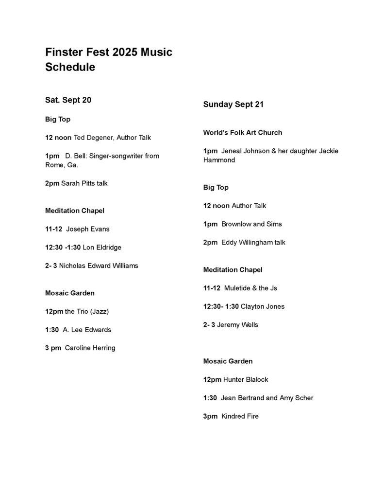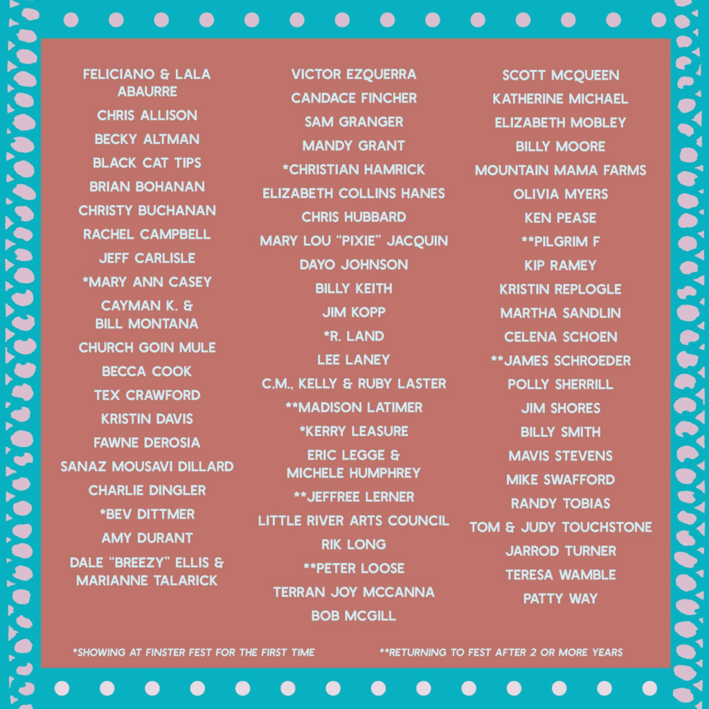 A note for artists interested in potentially showing at Finster Fest: it is an invite-only festival. We do not have an application process available for the 2026 festival. If you would like to be placed on the waiting list, please email . Please note that the waiting list does not mean you will necessarily be contacted. Thank you all for your interest in our festival.![]()